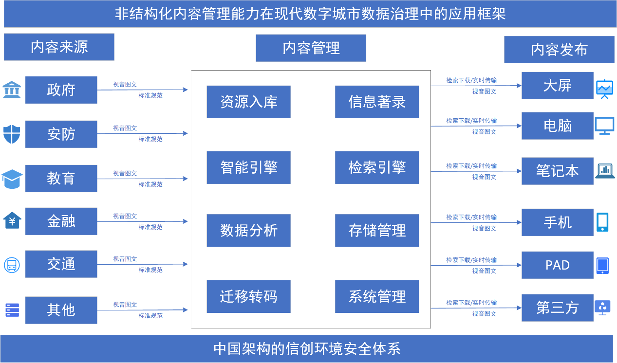 非结构化内容作为城市运行的重要数据资产类别,应扎根于信创环境,确保其运行环境和数据环境的安全。在此环境下,非结构化内容管理从内容来源、到内容管理、到内容发布进行全生命周期的管理,对现代数字城市产生的数据进行规范有序管理,变数据为资产,并挖掘其价值,为现代数字城市相关应用场景提供精准高效服务。